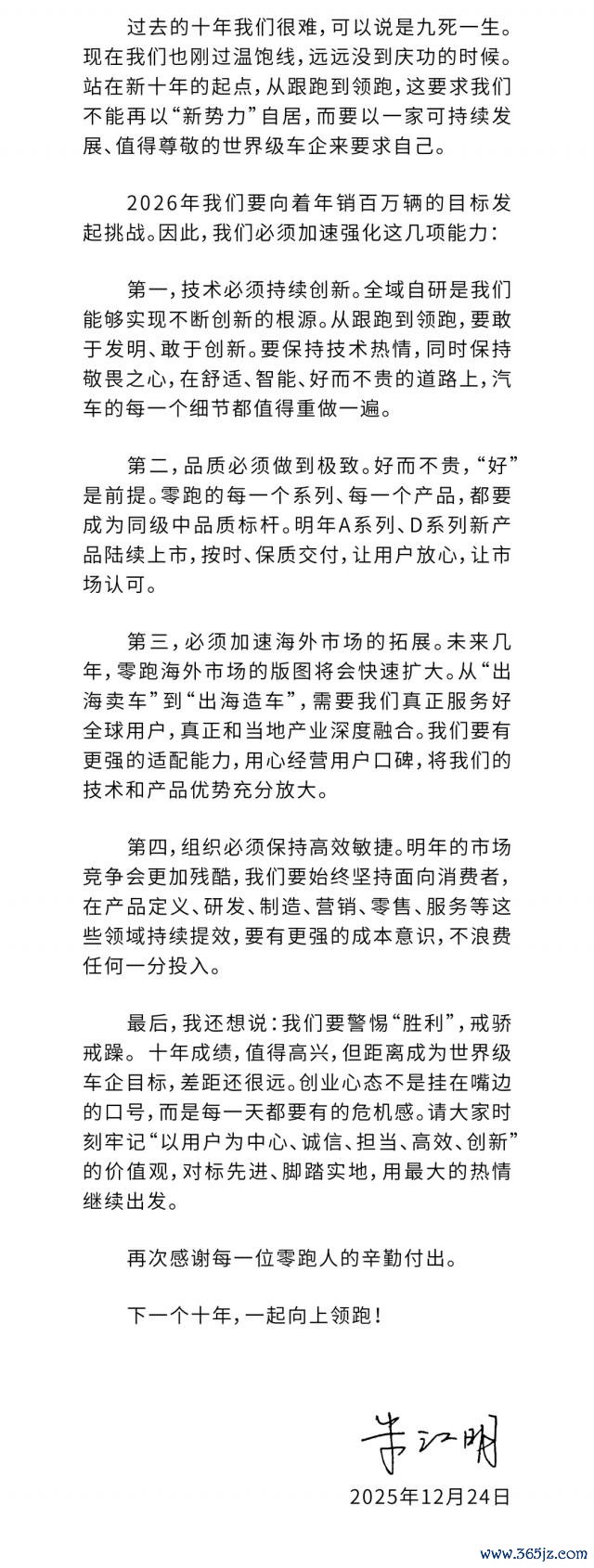 IT 之家 12 月 24 日音尘,零跑汽车当天迎来创立十周年,零跑汽车独创东说念主、董事长、CEO 朱江明发布《致举座零跑东说念主的一封信》,暗示 2026 年要向着年销百万辆的运筹帷幄发起挑战。 朱江明披露,2025 年当作创业第十年,零跑汽车完成了 5 年前制定的运筹帷幄,并交出了一份可以的答卷 —— 全年销量接近 60 万辆,公司有望杀后生度盈利,这是零跑遵循最丰硕的一年。 朱江明暗示:"以前的十年咱们很难,可以说是两世为人。目下咱们也刚过饱暖线,远远没到庆功的时期。站在新十年的早先,...